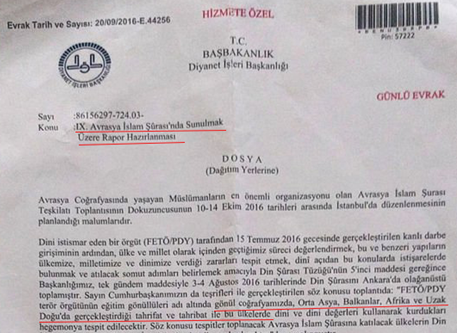 Algı operasyonu için istismar edilen belgenin Almanya, Finlandiya veya başka bir Avrupa ülkesindeki imamlarla ilintili olmadığı, terör örgüleriyle paralel hareket eden 'dost' devletlerin ve 'milli geçinen' kriptoların hakikatleri tahrif ederek siyasi rant devşirdiği 'sözde kanıt' belgede, gönül coğrafyamız olarak tanımlanan Orta Asya, Balkanlar, Afrika ve Uzak Doğu'ya atıfta bulunulduğu, bizzat Diyanet İşleri Başkanı Mehmet Görmez tarafından kanıtlarıyla basınla paylaşılmıştır.